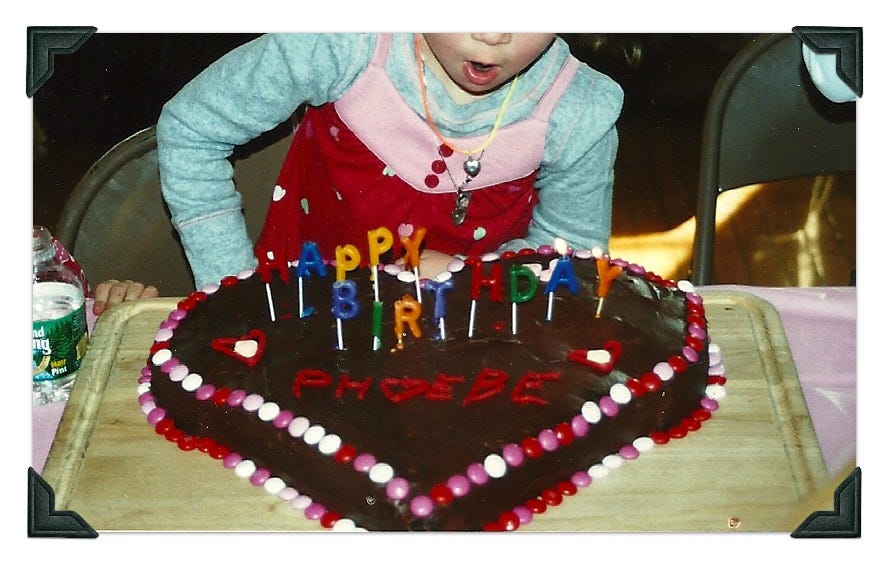 Chances are, if the cake was homemade, it was almost always some form of chocolate mud cake. The first photo up top is also mud cake, decorated with a ring of Dum Dum lollipops around the perimeter (a Victoria Granof trick), but here is Phoebe eating a version on her 5th or 6th. She used to love having heart-shaped cakes because her birthday is so close to Valentine’s Day. I shaped it into a heart using this old Heloise hack…