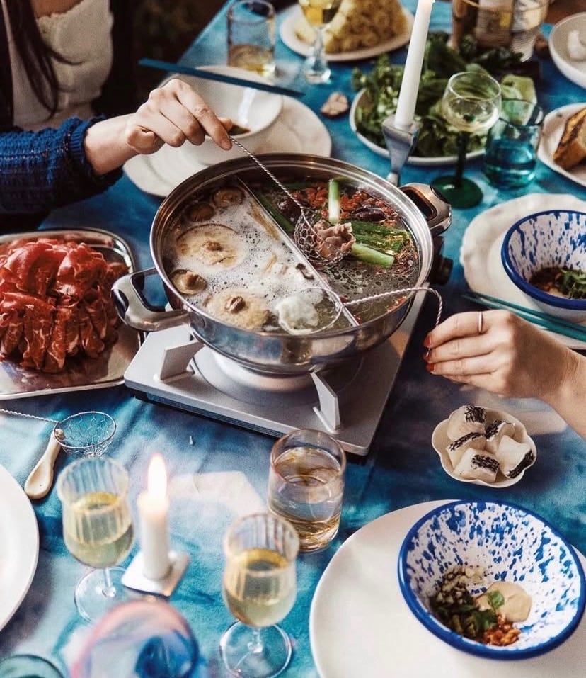 In addition to being a James Beard-Award nominated pastry chef, bestselling cookbook author and beloved New York-based social justice activist, Natasha Pickowicz is a hot pot fanatic. And, as she makes clear with her new book Everyone Hot Pot, she wants you to be one, too. Pickowicz grew up in San Diego, the daughter of a Beijing-born artist and a New England–born historian of China, and hot pot nights with friends and neighbors were what she looked forward to the most as a kid. “The windows would fog over with the billowing, aromatic steam, like we were in our own heaven, floating away on a cloud we had created,” she writes. “I was free to ‘play’ with my food—fishing for a fallen dumpling or tofu cube with my woven mesh basket, like a competitive game—and I made a mess without chiding or consequence.” For people new to the Hot Pot game, Natasha’s book expertly straddles the line between doable and aspirational, as she explains the history of the ancient Chinese cooking method (rapidly poaching morsels of vegetables, meats, seafood, and tofu in a communal broth), holds our hands through her hyper-organized, hyper-delicious sounding sample menus (“The Land and the Sea,” for instance, which features shrimp and kale skewers, scallop and fava been skewers, crab legs, tofu skins, bok choy, dark greens and so much more), and takes the whole sharing-a-meal-thing to the next level.