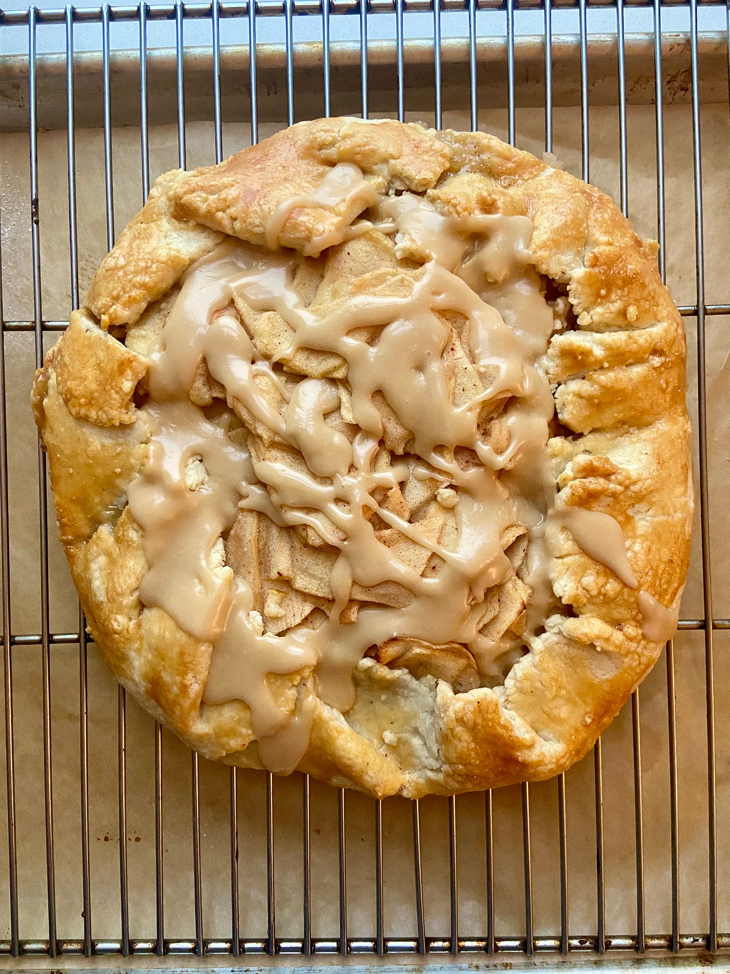 Once the galette has baked and cooled slightly, make your Maple Glaze: Add the butter and syrup to a small saucepan set over medium heat. As soon as butter melts, take the pan off heat and whisk in powdered sugar until creamy. Drizzle or pour over the pie right away. If the glaze hardens before you do this, place the saucepan back on the stovetop over low heat until it loosens.
