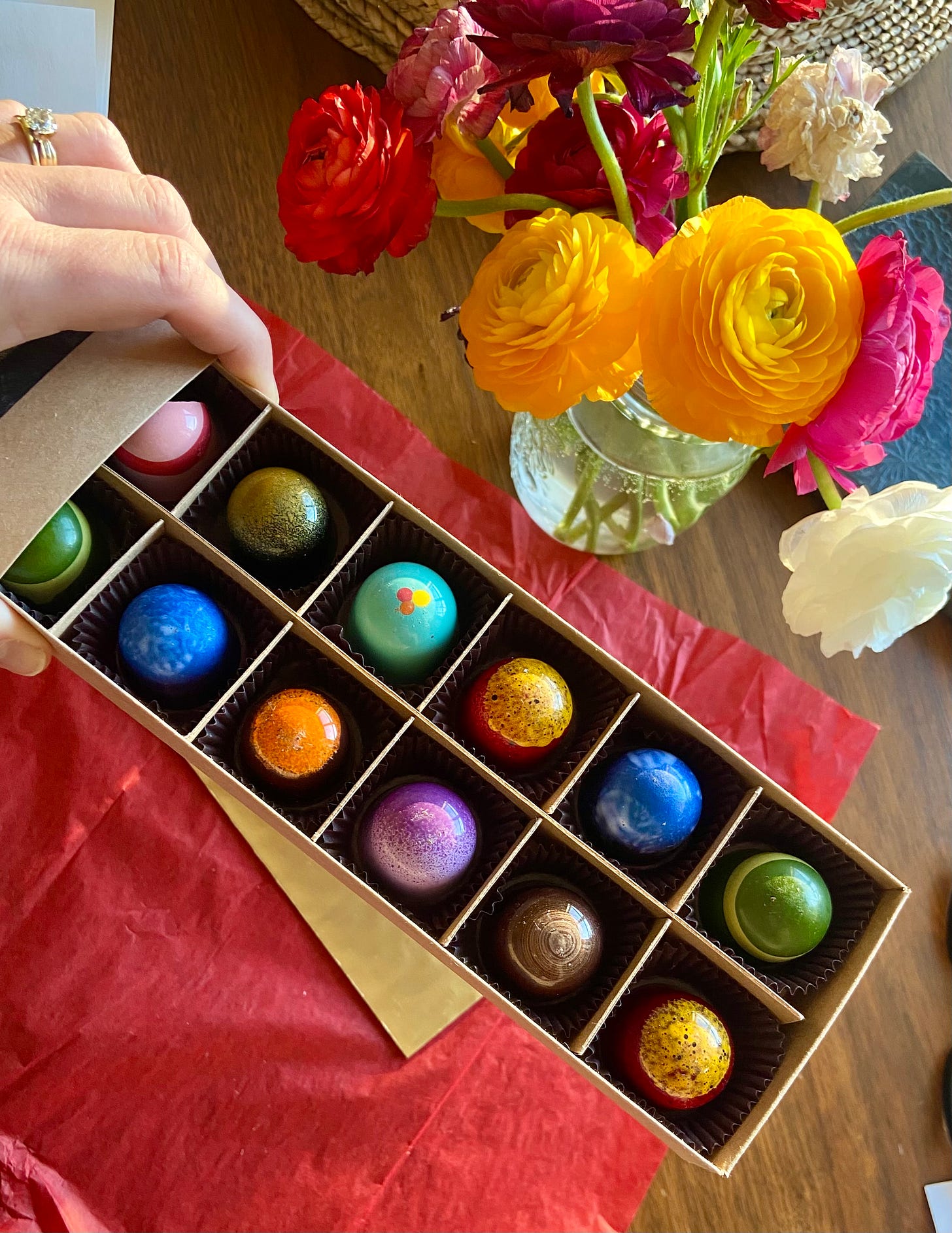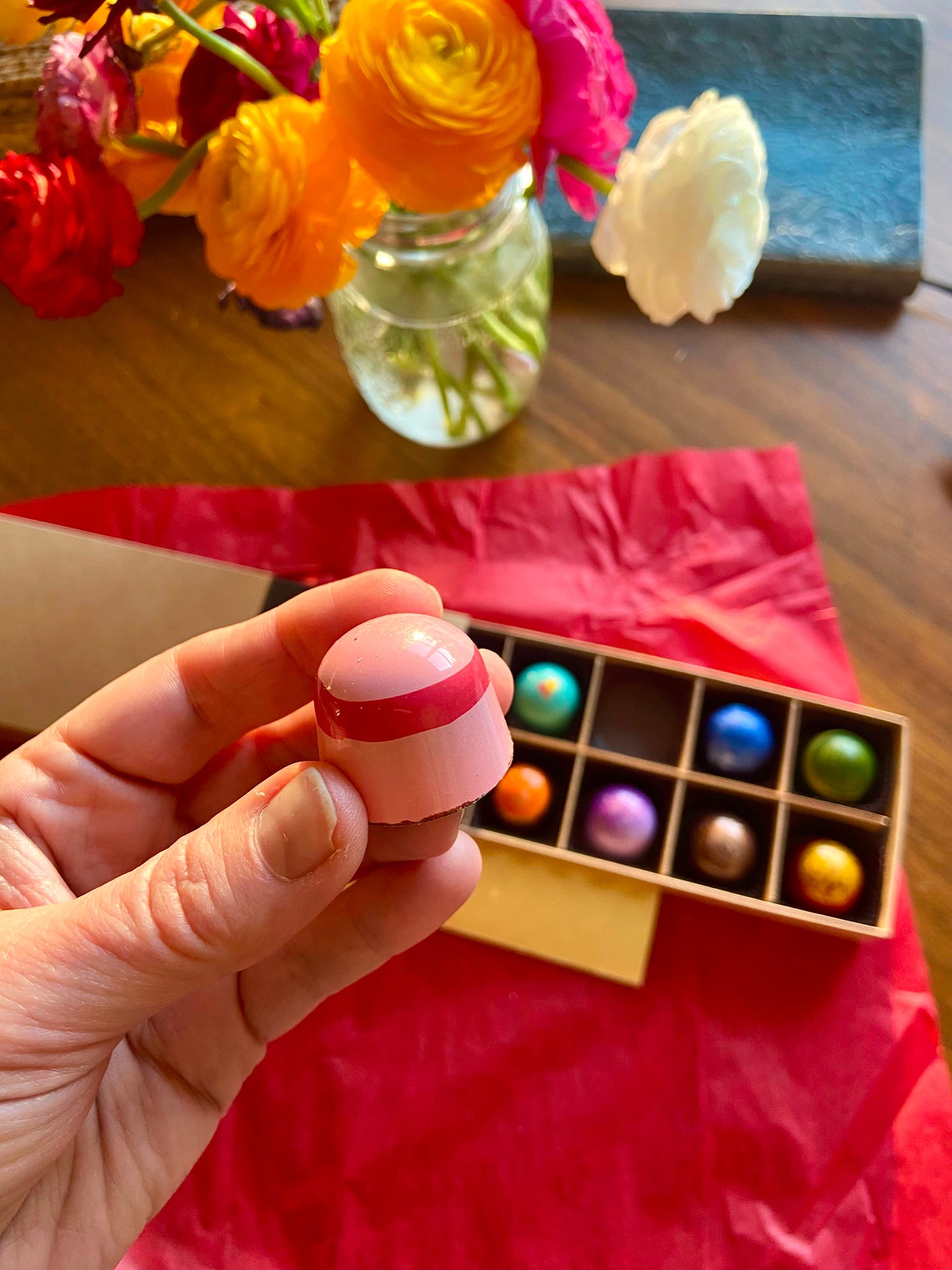 For the holidays this past year, a friend gave us the most extraordinary gift: A Dandelion Chocolate Advent Calendar, which offered not only 25 beautiful little confections from 25 small-batch makers across the country, but a QR code for each that linked to a video of its maker sharing their own personal story. I loved every bite, and took note of a few extra-special makers I wanted to order from directly next time I was in the market for chocolate. (Which is pretty much constantly.) One of these makers was Lulubee Chocolates in Lincoln, Nebraska who contributed a gingerbread-caramel truffle that had an exquisite balance of sweet and salt and crunch. On that two-bite experience alone, I decided to order a 12-piece box for a host gift, customizing the mix based on flavors I thought my friend would love, like the Pistachio, the Strawberry-Rhubarb (shown above), and a few of the Coconut Almonds which tasted like a Mounds Bar to the thousandth power. Spoiler alert: The gift was a hit, and I ordered the same exact box for my chocolate-obsessed daughter for her birthday. They’re so pretty they almost look fake, don’t you think?