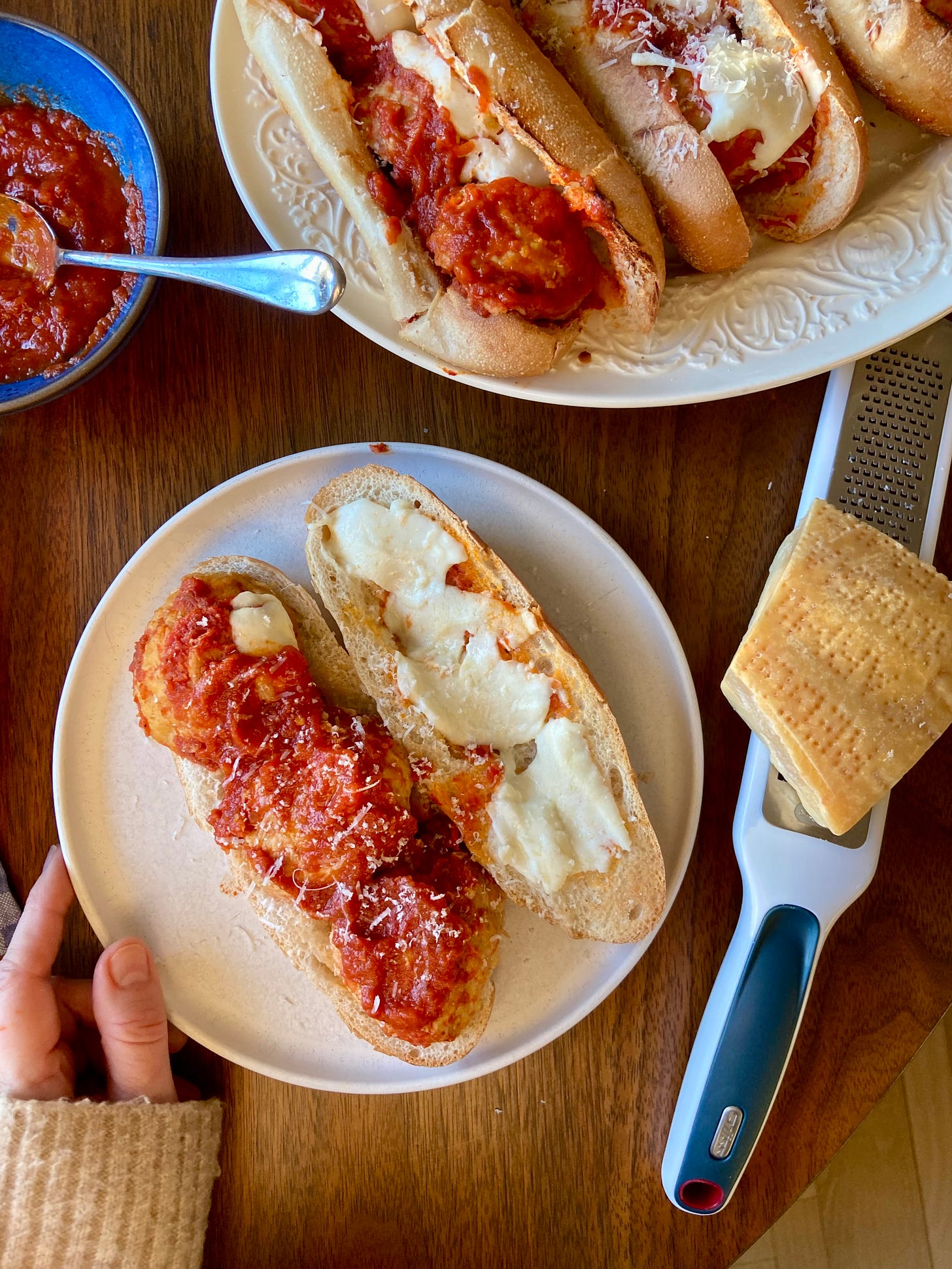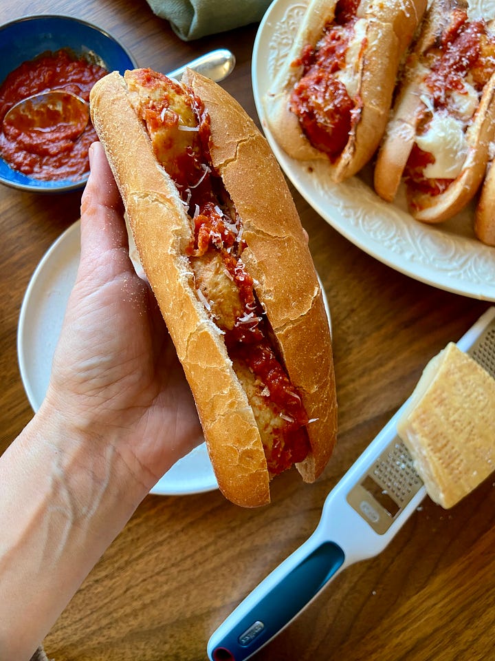 The broad strokes of this one is of course not complicated: Stuff Italian hoagie rolls with 2-3 warm meatballs and a little sauce, maybe melt some mozzarella on top under the broiler, serve with more sauce. But the finer points? Those hoagie rolls should be the kind you find in the bakery section of your supermarket, i.e. nothing fancy and crusty. You want the bread to have structure but still be somewhat soft which helps prevent the meatballs from shooting out the sides when you bite into the sandwich. (I often hollow out the rolls a bit if they seem too bready.) Next: It’s a good idea to halve your meatballs, which makes eating the sandwich an overall more compact and manageable experience. Lastly, for make-ahead: Prepare the sandwiches completely, stuffing with cheese and a little sauce, and wrap with foil. When you’re ready to eat, heat them (still in foil) at 350°F for 30 minutes. Serve with extra sauce and freshly grated Parm.