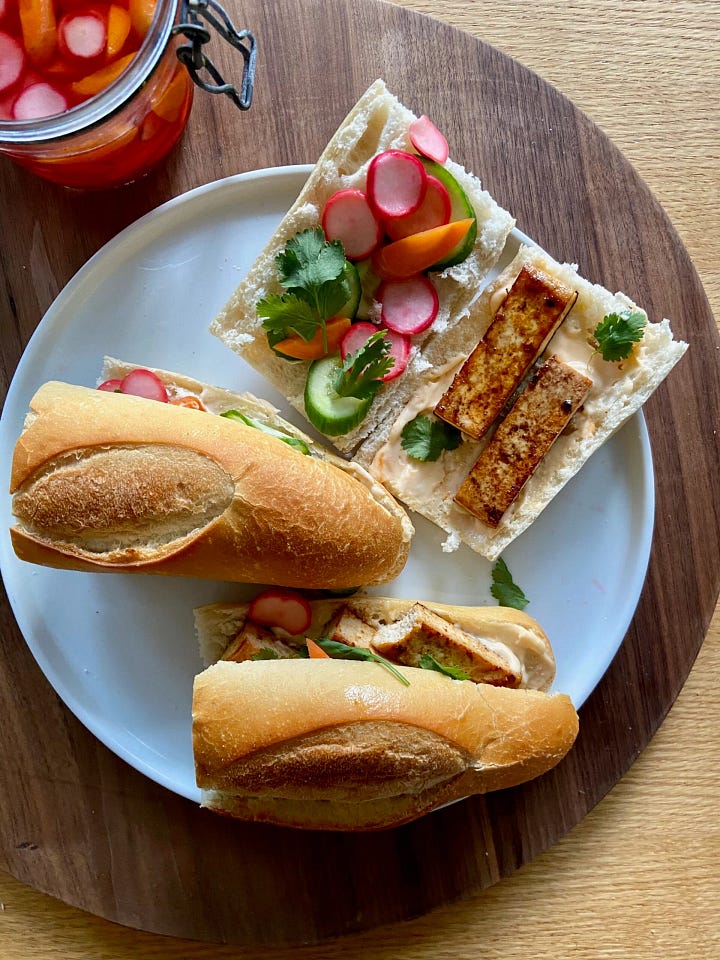This is always the go-to order for me when I hit my favorite local Vietnamese spot, but if I feel like making my own version, I generally go with the Tofu Bánh Mì in The Weekday Vegetarians. That recipe — a version is here — was heavily influenced by Andrea Nguyen, her books and her writing. (Shown, above right.)