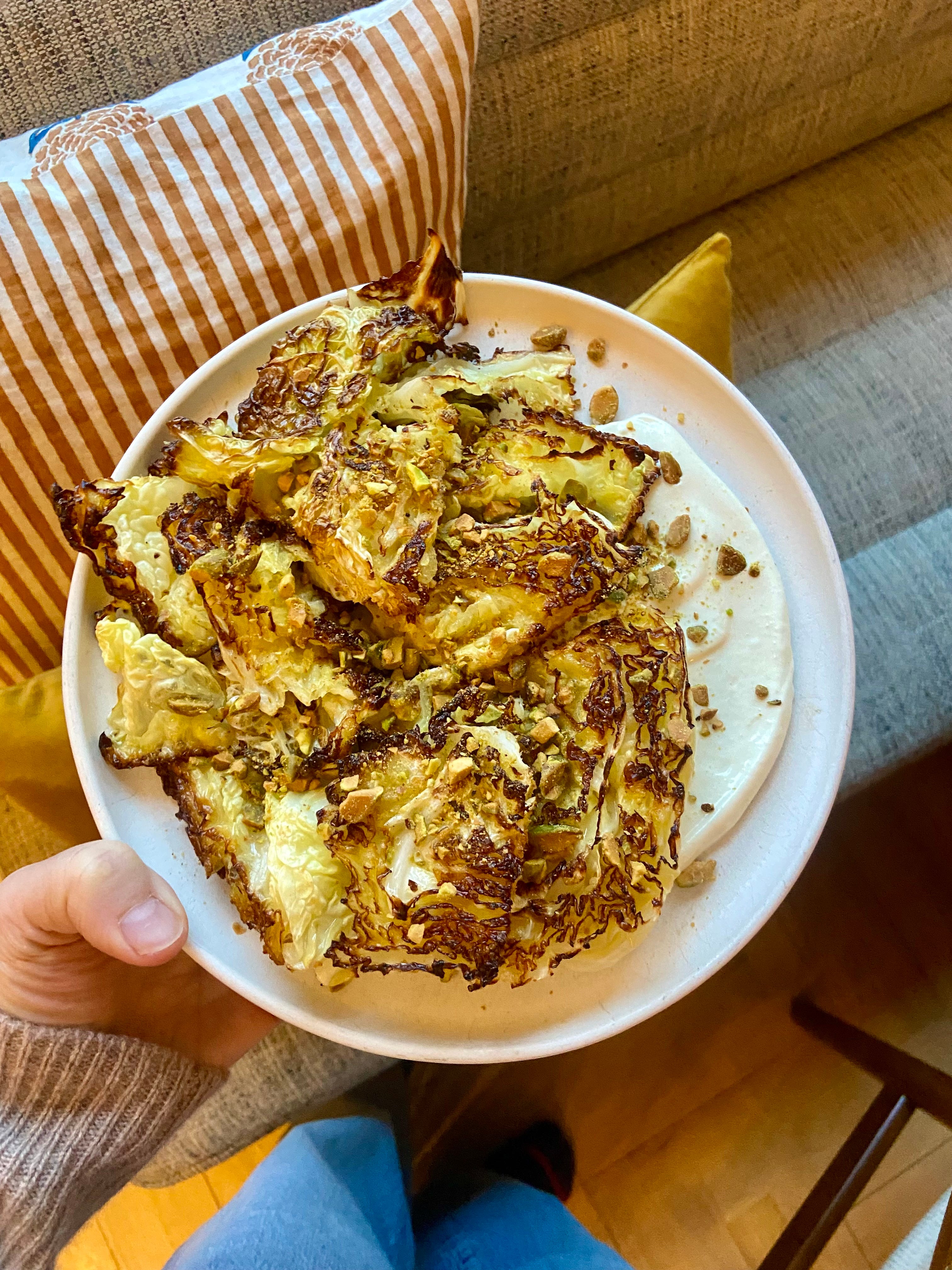 Heat the oven to 425°F. Line a baking sheet with parchment paper. Cut a small head of green cabbage in half through the core, then cut each half into thick slices, like you’re cutting a crusty boule. Arrange the slices on your baking sheet and drizzle them all over with olive oil, about 1/4 cup total. (I like using the Graza squeeze bottle olive oil for this so I can get into the nooks and crannies.) Gently flip the wedges so they retain their shape (it’s ok if they fall apart a little, don’t worry) and drizzle oil on the other side as well. Season with salt and pepper, and roast for 20 minutes. Using a spatula, again gently flip the wedges and roast another 10-15 minutes. (The cabbage should be charred and golden on the outside and tender in its folds.) While the cabbage roasts, whisk 1/2 cup plain yogurt (any fat content) with the juice of 1/2 lemon, salt, pepper, and a squeeze of honey. Top with crushed pistachios. If I had any fresh dill on hand, I would’ve absolutely sprinkled some on top.