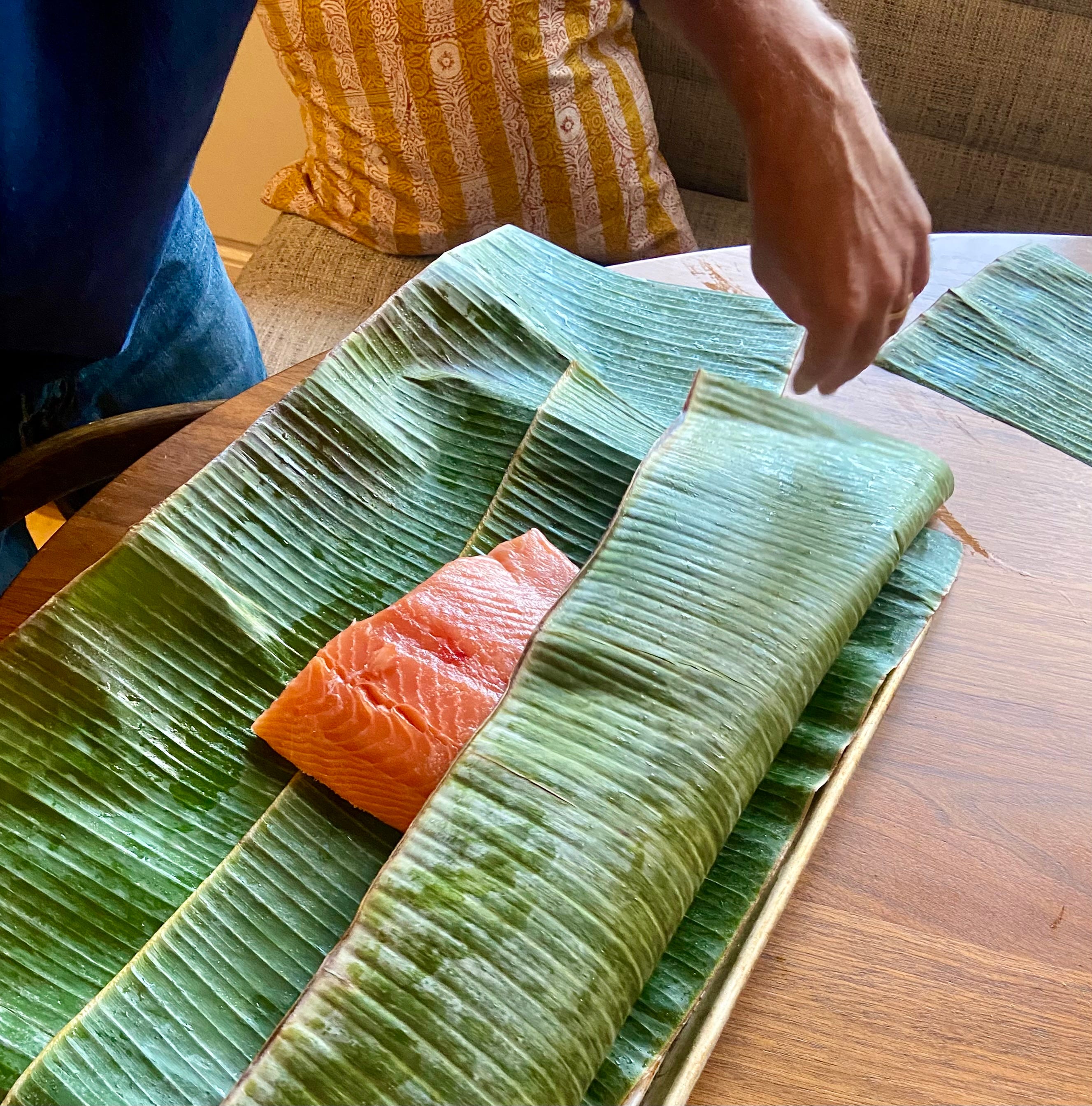 Banana-Leaf Salmon stars in this gluten-free, winter dinner production!