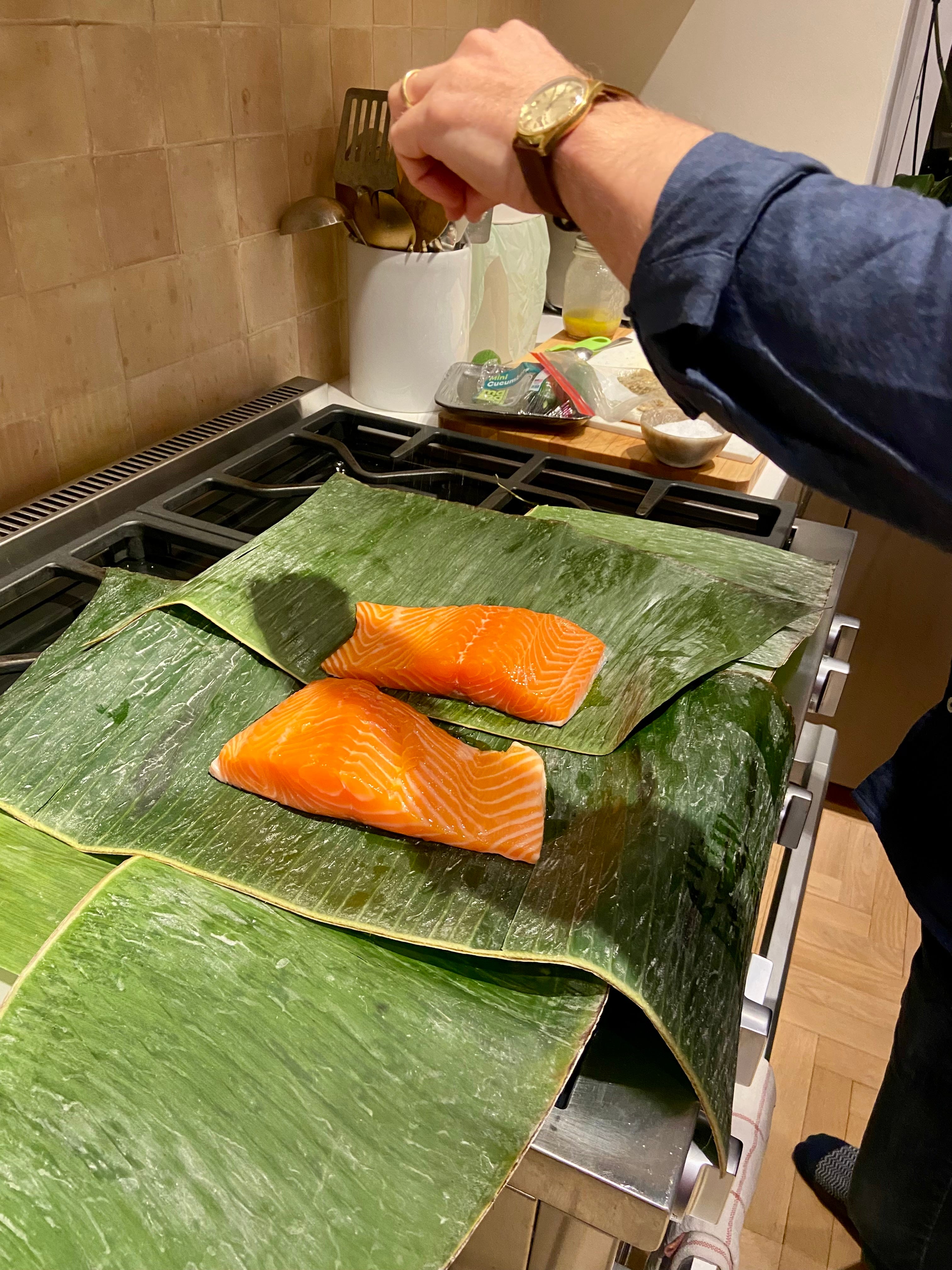 Have you ever baked fish in banana leaves? We never had until this past fall when we stumbled upon a recipe that used the technique in Samin Nosrat’s indispensable Good Things. And now we can’t seem to stop, especially when we have people over for dinner, because in addition to yielding a fragrant, herbal-infused, slow-roasted, meltingly tender fish, the whole technique just feels so theatrical and fun. Look how huge and dramatic those banana leaves are! (Samin’s recipe calls for fig leaves, but it’s easier for us to find banana leaves, which are usually in the freezer section of most supermarkets.) The leaves play the same role as parchment paper or foil in a fish en papillote, creating a sealed little oven that lets the fish steam in its own juices. Here’s the basic how-to: