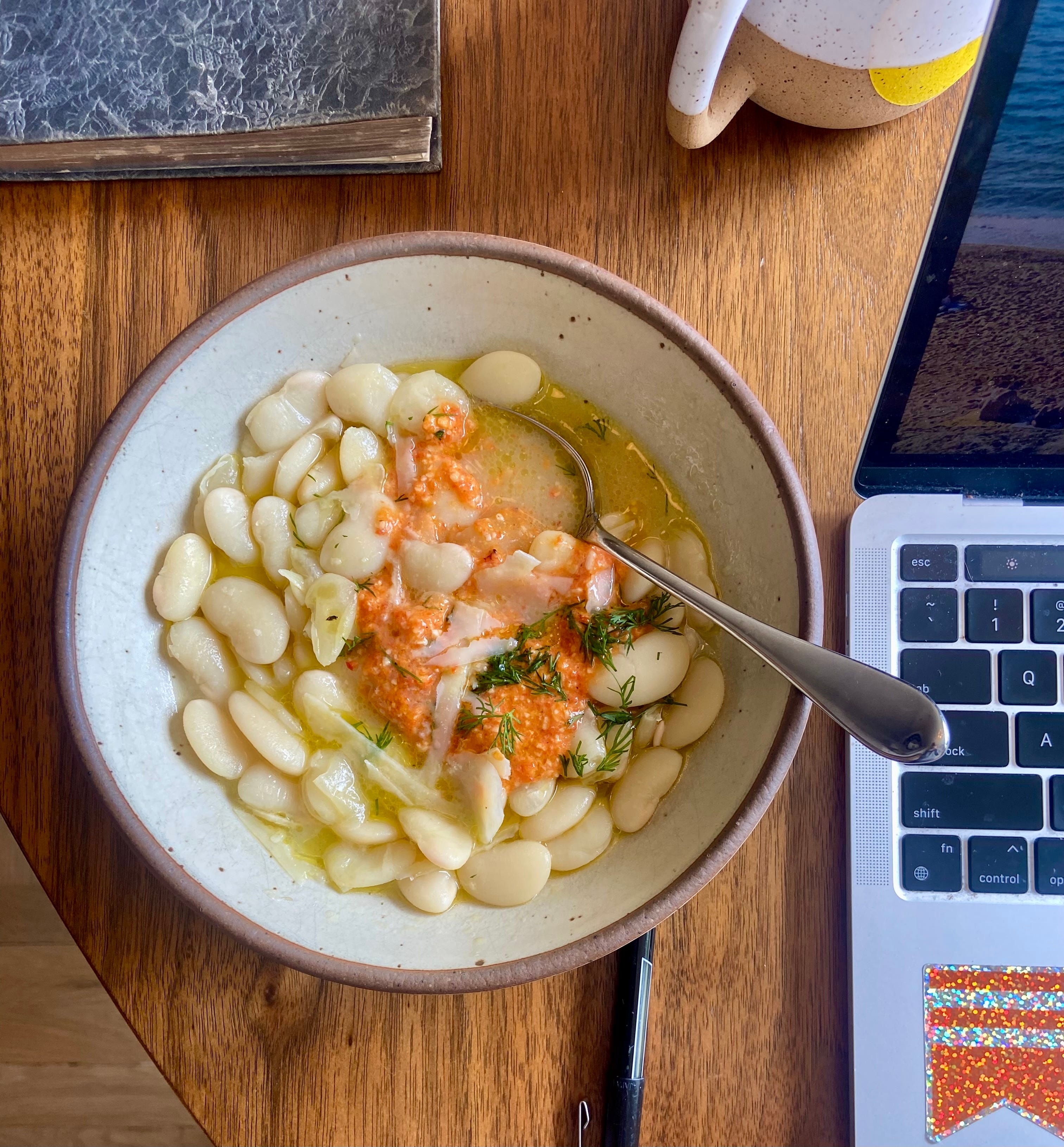 There was a time in my life when if I thought about sauce, particularly the kind of sauce that makes food taste better, my brain would head in the…comment-dit-on…French direction: Like the way one might add a few knobs of butter to a reduction, or a little bacon fat to the shallot dressing, or fold in a creamy béchamel to thicken a baked pasta. But ever since I adapted a more plant-forward way of eating, the sauces I crave aren’t based on animal fats, and they’re not rich and creamy at all — they’re herby, vegetable-based, tangy and bright, and when executed correctly, they really take dinners from good to great. I’m thinking of an herby green sauce on top of a slow-baked salmon or a spicy tomatillo sauce on refried bean and mushroom tacos, or a quick-as-lightning Romesco sauce that absolutely transforms my go-to brothy beans (above) while not letting them stray from Team Vegan. I have several dozen pages in The Weekday Vegetarians and The Weekday Vegetarians Get Simple devoted to this topic (SEE: “Magic Blender Sauces”) but I wanted to share the Romesco here so you really know what I’m talking about.